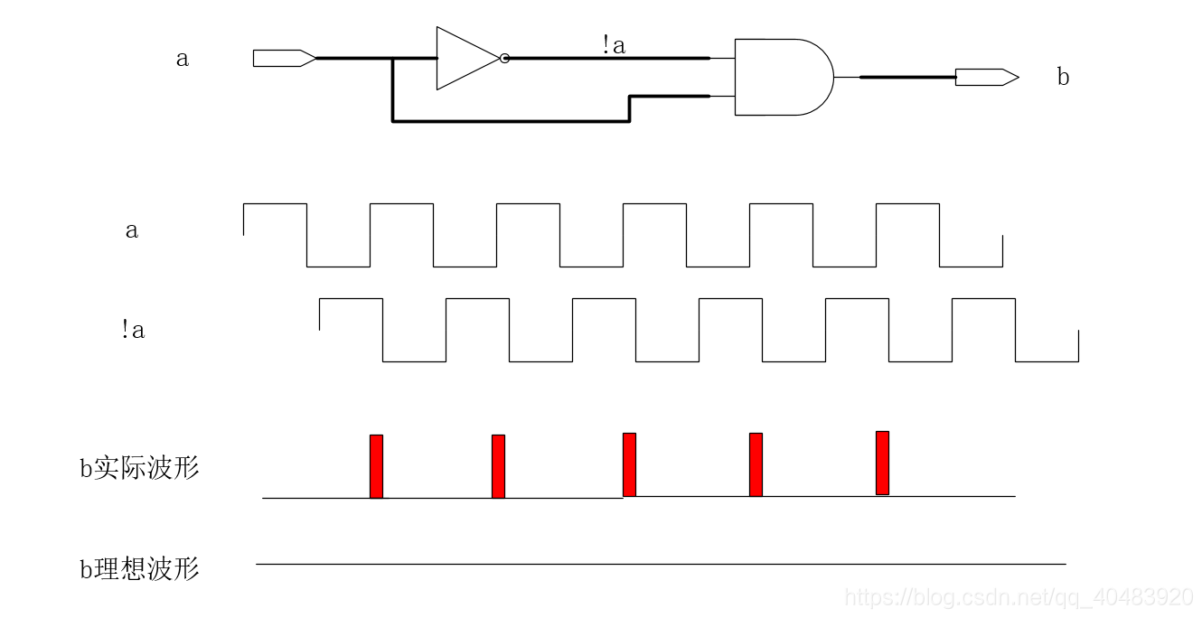 如上图,可以看到!a并不是与a完全对称,而是有一定延迟,这是因为在电路中,传输有一定的延迟,一个非门也有延迟。在a从0变为1之后一段时间,这时候!a还为高,并没有在a从0变为1的同时从1变为0。最终出现了尖峰脉冲。