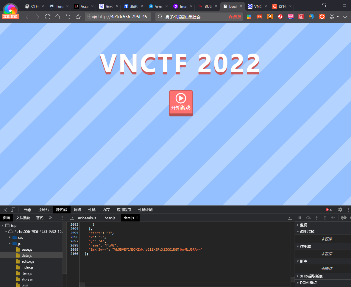找到源代码js文件中data.js搜索flag发现base64加密后的字符串,解码后即可得到flag